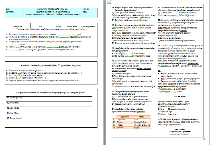 2017-2018 Sosyal Bilgiler 5 1.Dönem 1.Yazılı Sınavı