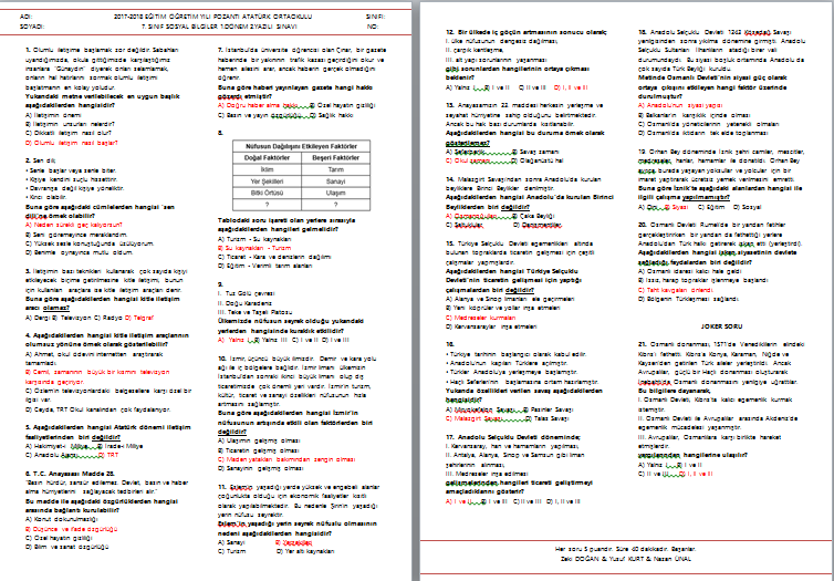 2017-2018 Sosyal Bilgiler 7 1.Dönem 2.Yazılı Sınavı