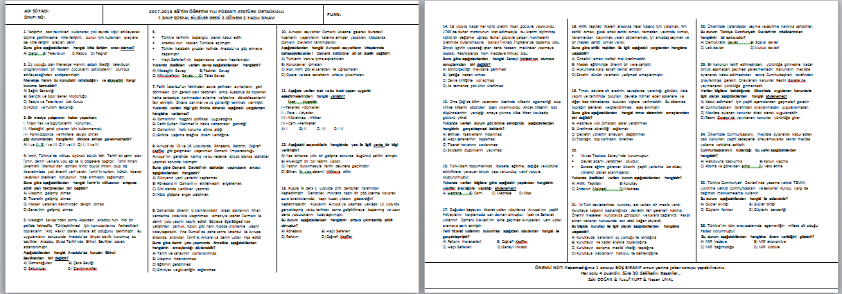 2017-2018 Sosyal Bilgiler 7 2.Dönem 2.Yazılı