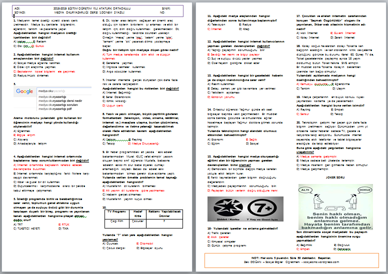 Medya Okuryazarlığı 1.Dönem 2.Yazılı Sınavı İNDİR