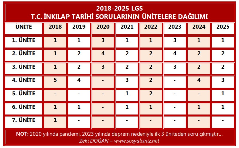 2018-2025 LGS T.C. İNKILAP TARİHİ SORULARININ ÜNİTELERE DAĞILIMI PDF