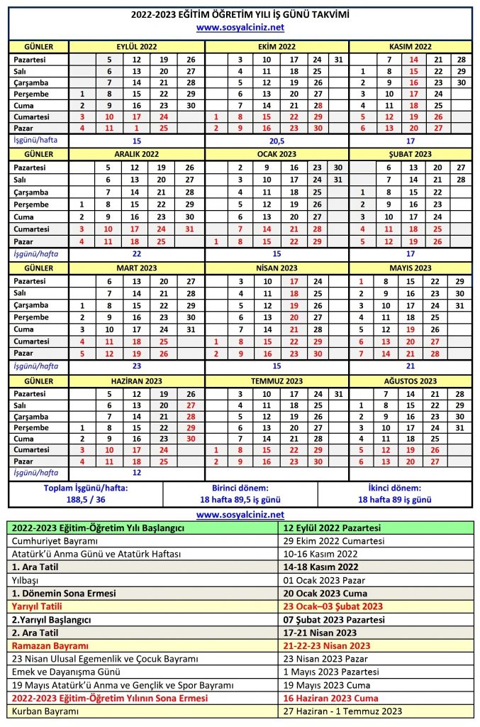2022-2023 Eğitim Öğretim Yılı Çalışma ve İş Günü Takvimi