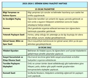 2023-2024 I. Dönem Son Hafta Yapılacak Faaliyetler Tablo