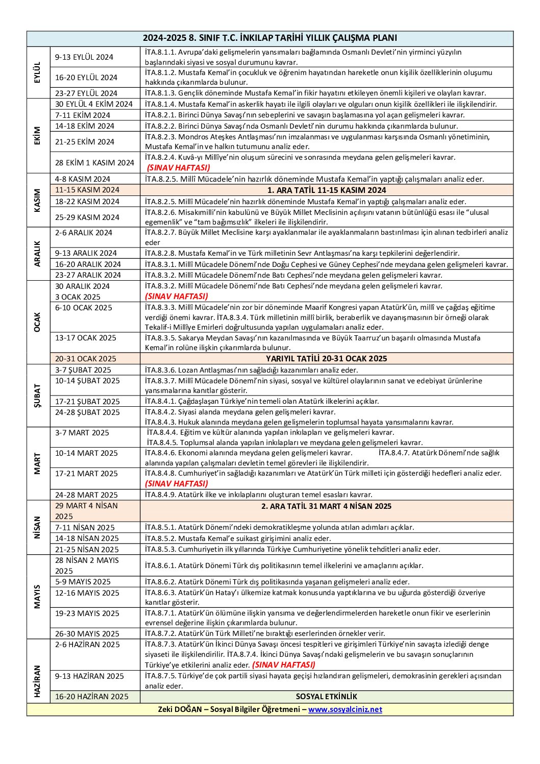 2024-2025 8. Sınıf T.C. İnkılap Tarihi Yıllık Çalışma Planı