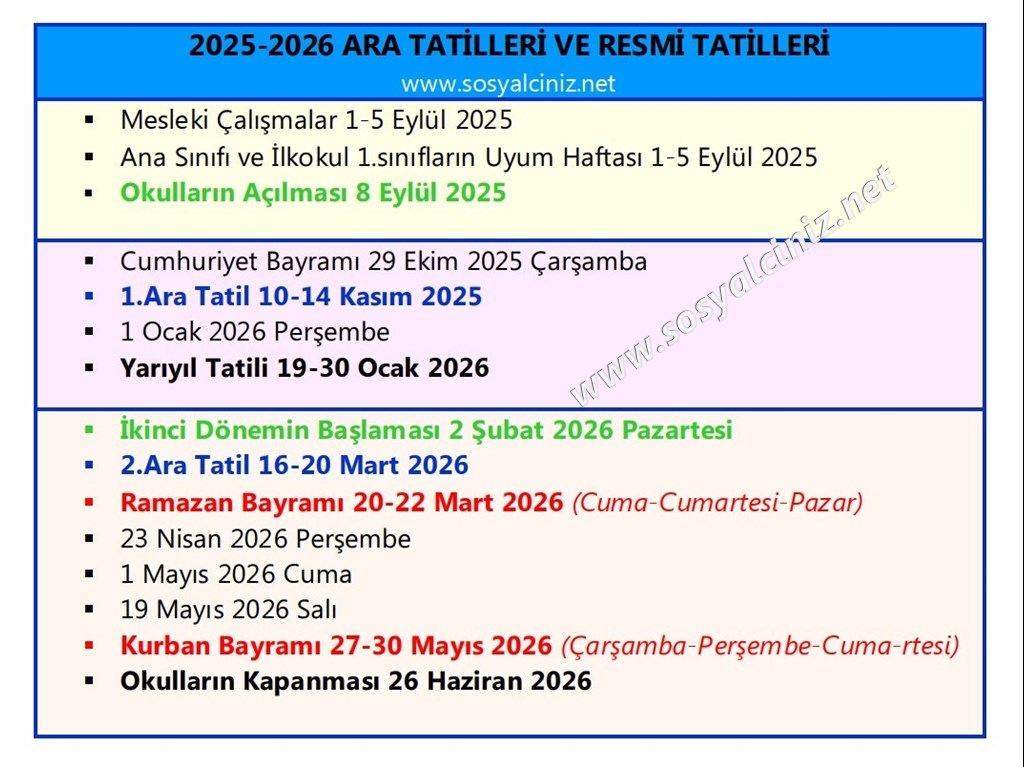 2025-2026 Ara Tatilleri ve Resmi Tatiller