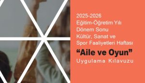 2025-2026 eğitim ve öğretim yılında “Dönem Sonu Kültür, Sanat ve Spor Faaliyetleri Haftası” etkinliklerinin teması “Aile ve Oyun” olarak belirlenmiştir. Bu kapsamda öğrenciler, aileleri ile birlikte okulların imkânları dâhilinde düzenlenecek etkinliklere katılacaklardır.