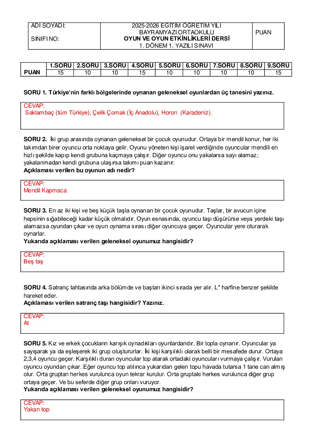 2025-2026 OYUN VE OYUN ETKİNLİKLERİ 1. DÖNEM 1. YAZILI-CEVAPLI