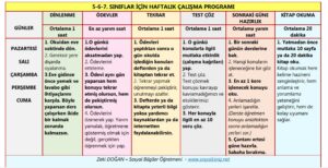 5-6-7. Sınıflar İçin Ders Çalışma Programı