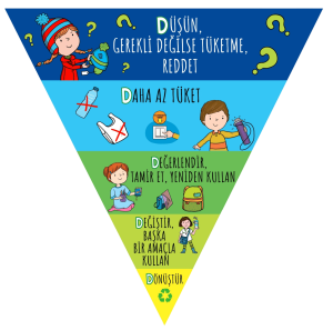 4. Dönüştür: Kâğıt, plastik, cam gibi atıkları geri dönüşüme göndeririz.