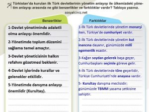 6.Sınıf Sosyal Bilgiler Kitabı Sayfa 117’de yer alan Türkistan’da kurulan ilk Türk devletlerinin yönetim anlayışı ile ülkemizdeki yönetim anlayışı arasında Benzerlik ve Farklılıklar etkinliğinin cevaplarıdır.