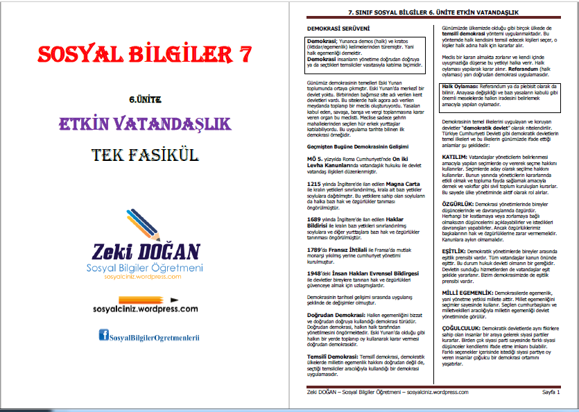 7.Sınıf Sosyal Bilgiler 6.Ünite Etkin Vatandaşlık Tek Fasikül