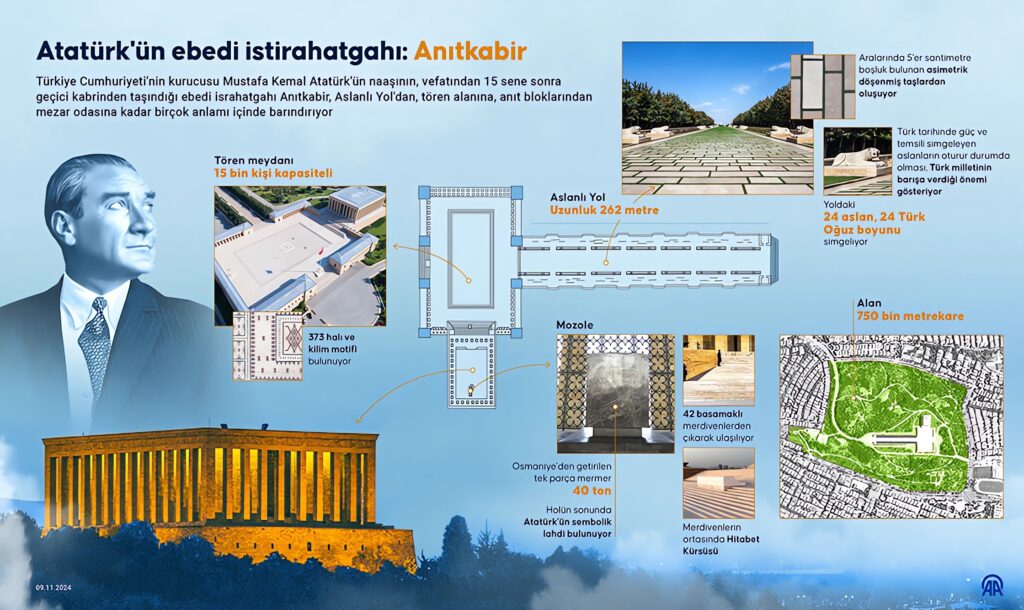 Türkiye Cumhuriyeti’nin kurucusu Mustafa Kemal Atatürk’ün naaşının, vefatından 15 sene sonra geçici kabrinden taşındığı ebedi israhatgahı Anıtkabir, Aslanlı Yol’dan, tören alanına, anıt bloklarından mezar odasına kadar birçok anlamı içinde barındırıyor. Grafik: Yasin Demirci/AA