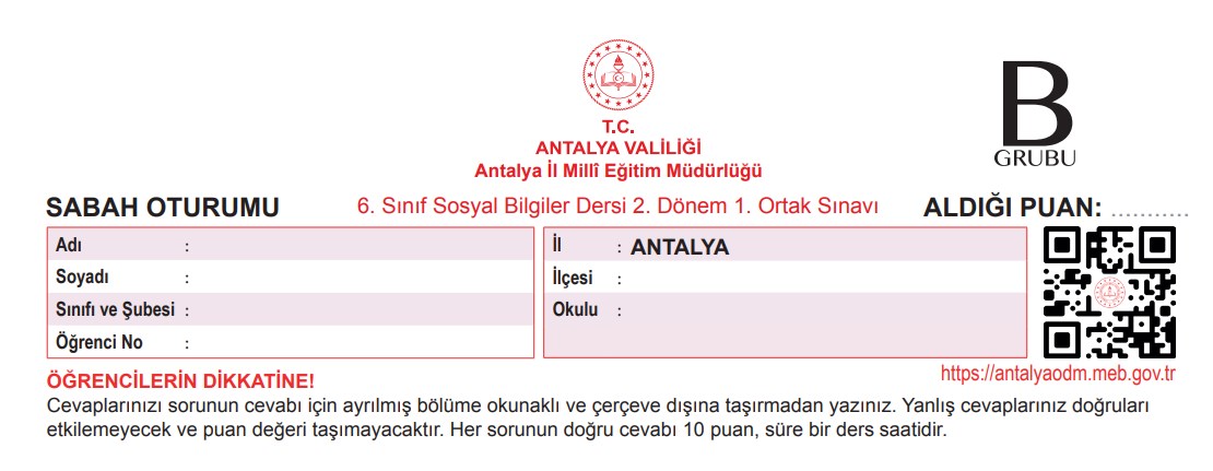Antalya MEM 6. Sınıf Sosyal Bilgiler Dersi 2. Dönem 1. Ortak Sınavı