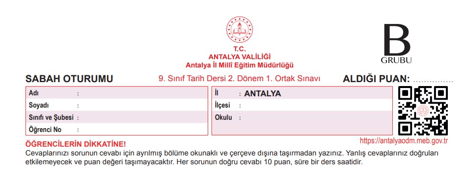 antalya mem 9. sınıf tarih 2. dönem 1. ortak yazılı sınavı