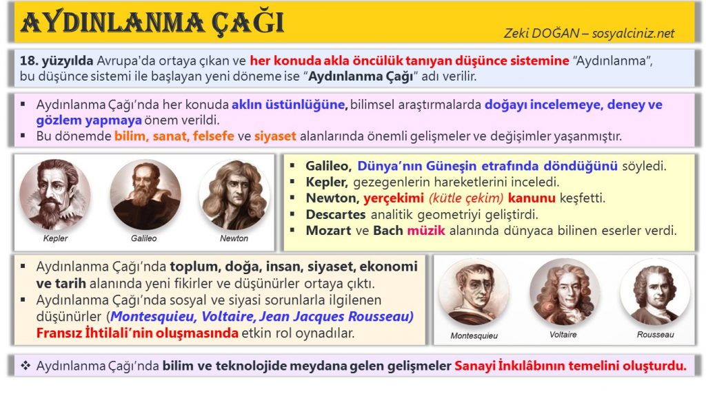 Aydınlanma Çağı’nda her konuda aklın üstünlüğüne, bilimsel araştırmalarda doğayı incelemeye, deney ve gözlem yapmaya önem verildi. Galileo Dünya’nın Güneşin etrafında döndüğünü söyledi.