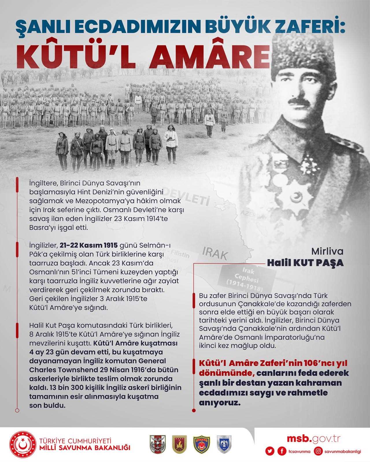 Tümgeneral Charles Vere Ferrers Townshend komutasındaki İngiliz birliklerinin teslim alınmasıyla kazanılan Kut’ül Amare zaferi, Çanakkale’nin ardından Birinci Dünya Savaşı’nın “en büyük zaferi” olma niteliği taşıyor.