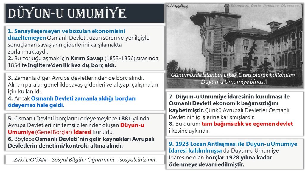 • Bunun üzerine 1881 yılında Avrupa Devletleri’nin temsilcilerinden oluşan Düyun-u Umumiye (Genel Borçlar) İdaresi kuruldu. Böylece Osmanlı Devleti’nin gelir kaynakları Avrupalı Devletlerin denetimi/kontrolü altına alındı.
