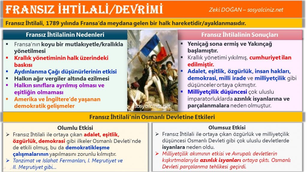 Fransız İhtilali ile ortaya çıkan adalet, eşitlik, özgürlük, demokrasi gibi ilkeler Osmanlı Devleti’nde de etkili olmuş, bu da demokratikleşme çalışmalarının yapılmasını zorunlu kılmıştır. Tanzimat ve Islahat Fermanları, I. ve II. Meşrutiyet gibi…