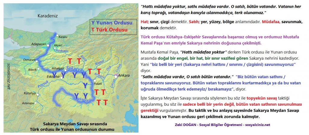 “Hattı müdafaa yoktur, sathı müdafaa vardır, o satıh bütün vatandır. Vatanın her karış toprağı kanla sulanmadıkça bırakılamaz.” Mustafa Kemal Paşa
