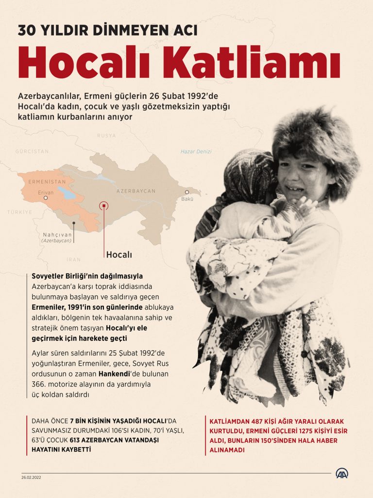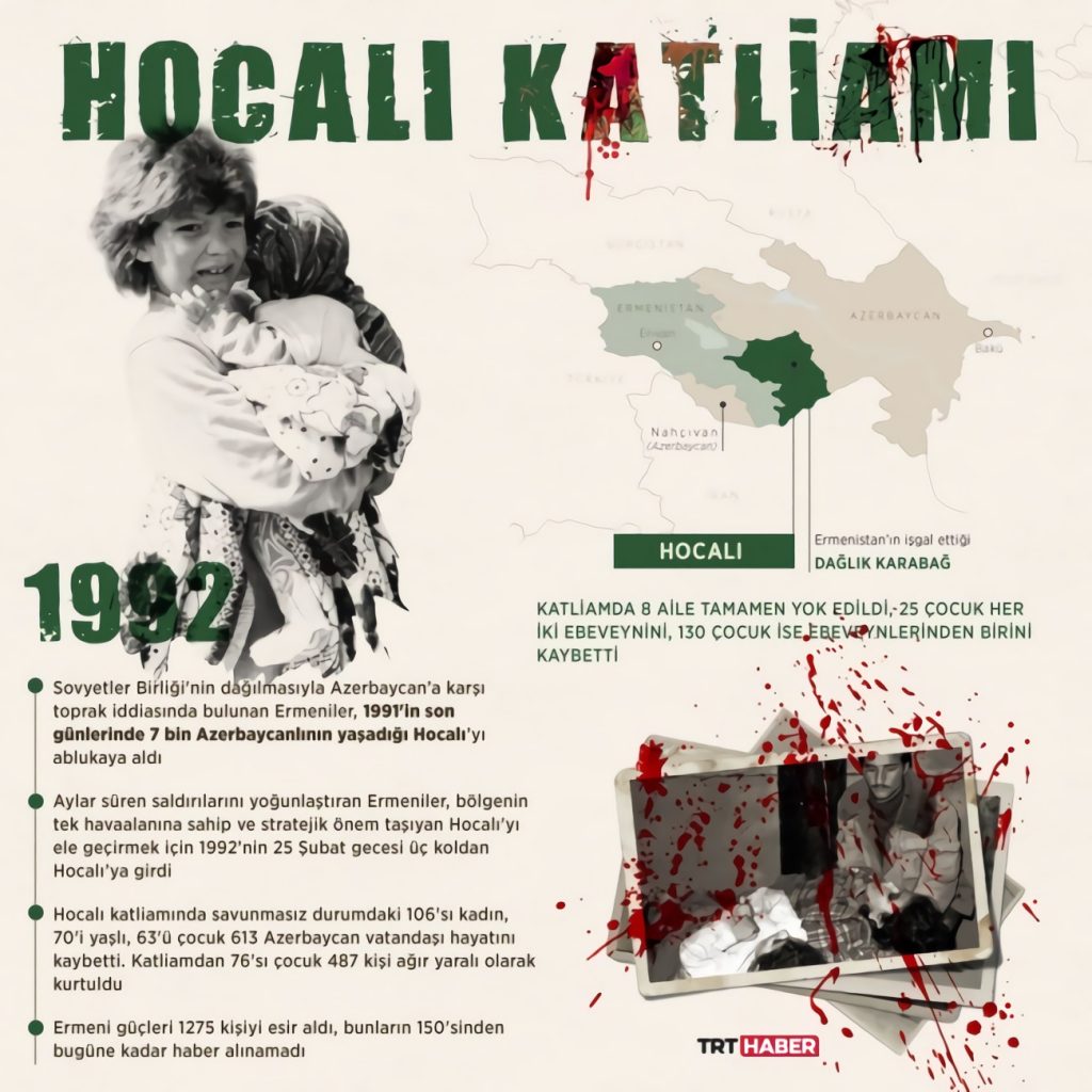 Tarihe kara bir leke olarak geçen katliam, Azerbaycan’ın Dağlık Karabağ bölgesindeki Hocalı kasabasında meydana geldi. Ermeni kuvvetleri kadın, erkek, çocuk ayrımı yapmaksızın önüne geleni katletti.