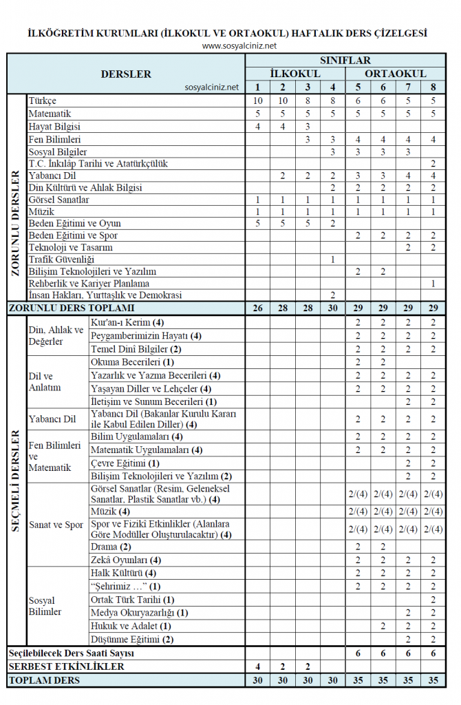 İlköğretim Kurumları(İlkokul-Ortaokul) Haftalık Ders Çizelgesi İNDİR