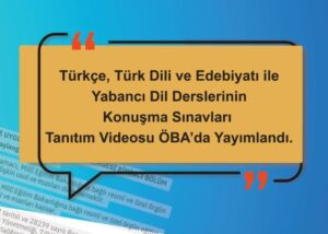 Ölçme, Değerlendirme ve Sınav Hizmetleri Genel Müdürlüğü tarafından hazırlanan “Türkçe, Türk Dili ve Edebiyatı ile Yabancı Dil Derslerinin Konuşma Sınavları” başlıklı video, Öğretmen Bilişim Ağı’nda (ÖBA) yayımlandı.