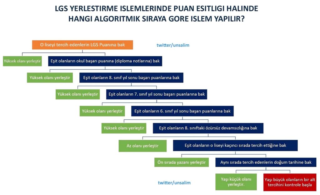 Salim Ünsal tarafından hazırlanan LGS yerleştirme işlemlerinde puan eşitliği halinde nasıl işlem yapılacağını gösteren infografik