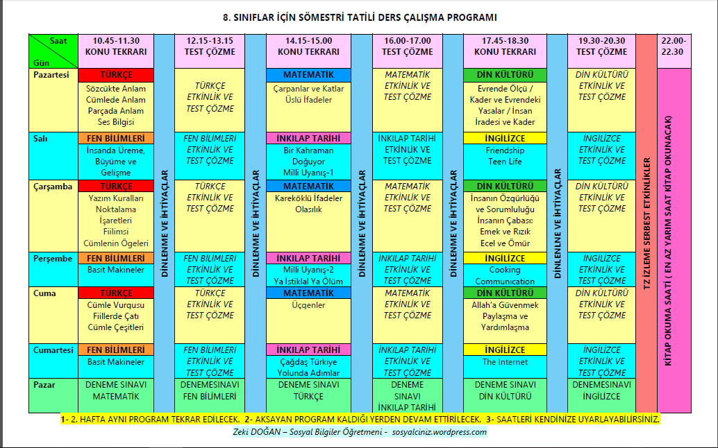 Liselere Hazırlık Yarıyıl Ders Çalışma Programı