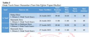 2023-2024 eğitim öğretim yılının 1. dönem 2. yazılı sınavlarından 6. sınıf Türkçe ve matematik dersleri 26 Aralık 2023 Salı günü, 9. sınıf Türk dili ve edebiyatı ile matematik dersleri ise 27 Aralık 2023 Çarşamba günü ülke genelinde ortak olarak gerçekleştirilecektir.