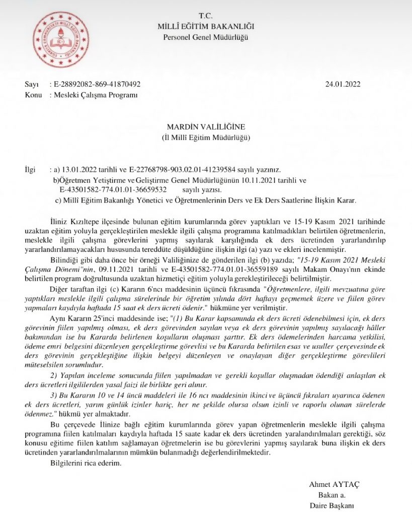 İliniz Kızıltepe ilçesinde bulunan eğitim kurumlarında görev yaptıkları ve 15-19 Kasım 2021 tarihinde uzaktan eğitim yoluyla gerçekleştirilen meslekle ilgili çalışma programına katılmadıkları belirtilen öğretmenlerin, meslekle ilgili çalışma görevlerini yapmış sayılarak karşılığında ek ders ücretinden yararlandırılıp yararlandırılamayacakları hususunda tereddüte düşüldüğüne ilişkin ilgi (a) yazı ve ekleri incelenmiştir.
