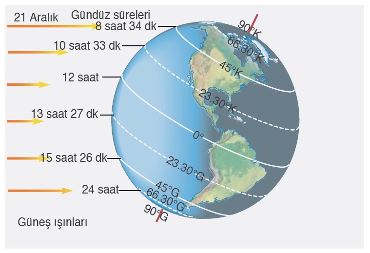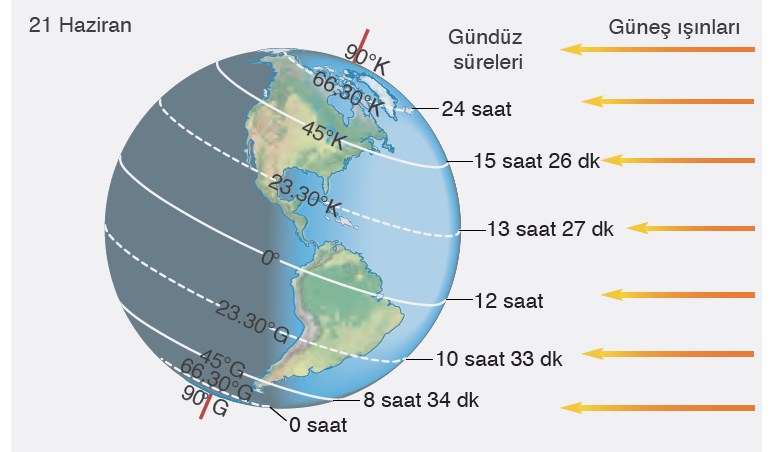 • Kuzey Yarım Küre’de en uzun gündüz, en kısa gece; Güney Yarım Küre’de ise en uzun gece, en kısa gündüz yaşanır. Kuzey Kutup Noktası’na doğru gidildikçe gündüz, Güney Kutup Noktası’na doğru gidildikçe gece süresi uzar.