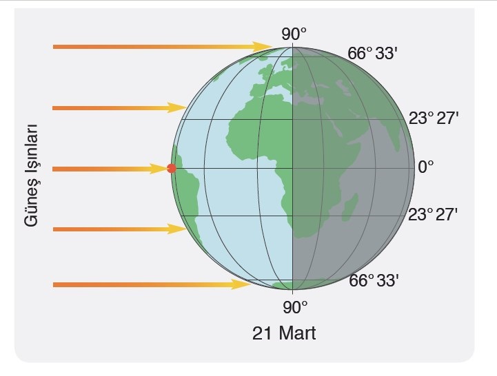 • Güneş ışınları öğle vakti Ekvator’a dik açıyla düştüğü için Ekvator’da yatay bir düzleme dik olarak yerleştirilen bir çubuğun gölge boyu, öğle vakti sıfır olur. Ekvator ve çevresinde ısınma artar. Kuzey Yarım Küre’de ilkbahar, Güney Yarım Küre’de sonbahar mevsimleri başlar.