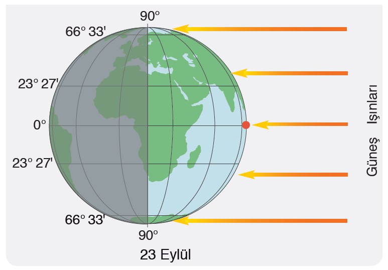 • Kuzey ve Güney Yarım Küre’de aynı dereceli enlemler Güneş ışınlarını aynı açı ile alır. Kuzey Yarım Küre’de sonbahar, Güney Yarım Küre’de ilkbahar mevsimi başlar.