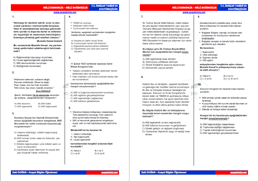 MİLLİ EGEMENLİK MİLLİ BAĞIMSIZLIK TESTİ ONLİNE ÇÖZMEK İÇİN TIKLAYINIZ.
