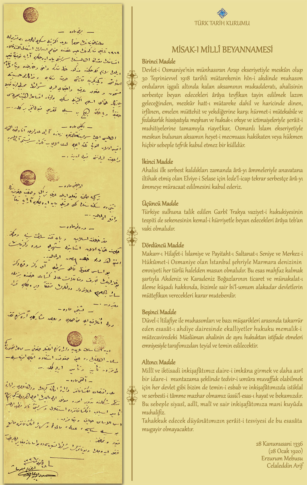 1. Osmanlı Devleti’nin sadece Arap çoğunluğunun yaşadığı, 30 Ekim 1918 tarihli Mütarekenin imzalanması sırasında işgal altında kalan kısımlarının mukadderatı ahalisinin serbestçe vereceği oylara göre belirleneceğinden adı geçen Mütareke hattının içinde ve dışında dinen, ırken, emelen birleşmiş, karşılıklı sevgi ve fedakârlık hisleriyle dolu, örfî ve içtimaî haklarıyla mahallî şartlara tamamen riayetkâr Osmanlı-İslâm ekseriyetiyle meskûn bulunan kısımların tamamı hakikaten ve hükmen hiçbir sebeple ayrılma kabul etmez bir bütündür.
