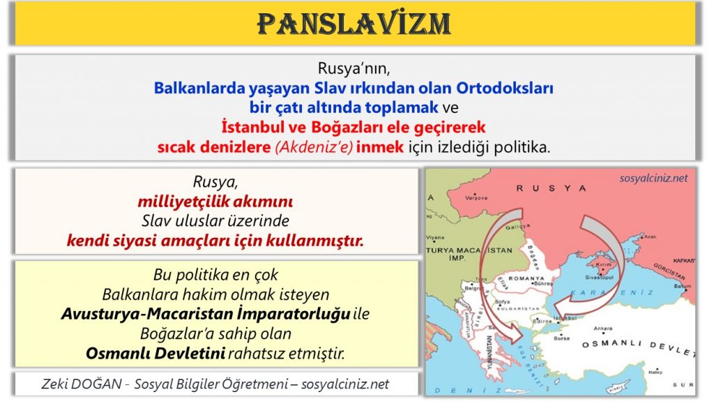 • Rusya’nın, Balkanlarda yaşayan Slav ırkından olan Ortodoksları bir çatı altında toplamak ve İstanbul ve Boğazları ele geçirerek sıcak denizlere (Akdeniz’e) inmek için izlediği politika.