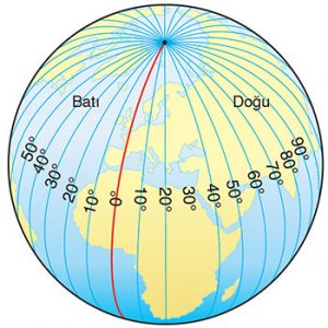 • İngiltere’nin Londra şehrinden geçtiği varsayılan meridyen, Başlangıç Meridyeni Greenwich olarak kabul edilir ve 0 olarak gösterilir.