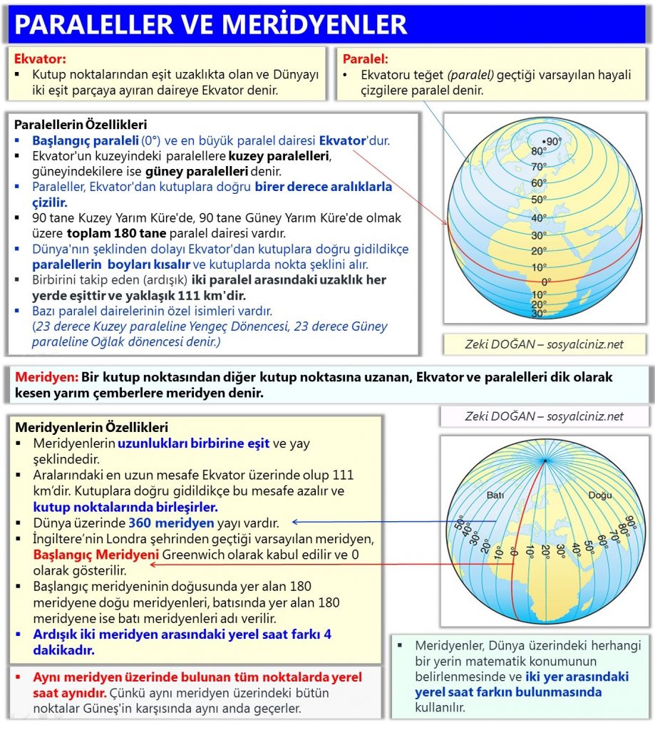 Meridyen: Bir kutup noktasından diğer kutup noktasına uzanan, Ekvator ve paralelleri dik olarak kesen yarım çemberlere meridyen denir.