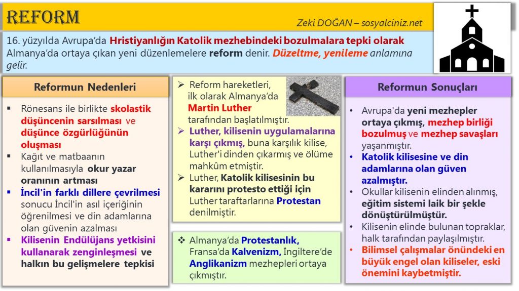 16. yüzyılda Avrupa’da Hristiyanlığın Katolik mezhebindeki bozulmalara tepki olarak Almanya’da ortaya çıkan yeni düzenlemelere “Reform” denir.