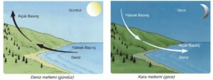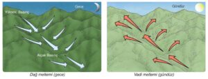 Meltem Rüzgârları: Gece ve gündüz arası sıcaklık farkına bağlı olarak ortaya çıkan rüzgârlardır. Bu rüzgârlar gece ve gündüz arası sıcaklık farkının yaşandığı kara ve denizler ile dağ ve vadiler arasında oluşur.