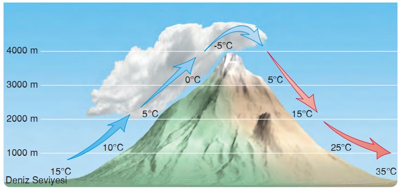 Föhn (Fön) Rüzgârları: Nemli hava kütlesi yamaç boyunca yükselirken 200 metrede ortalama 1⁰C sıcaklık kaybeder. Hava kütlesi, belli bir yükseklikten sonra yoğuşur ve nemini yağış şeklinde bırakır.