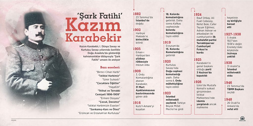 Kâzım Karabekir doğuda Ermeni mezalimi sonucu yetim kalan binlerce çocuğa sahip çıktı. Kolordunun imkânlarını kullanarak yetimler için Sanayi Mektebi, Leylî Eytâm İbtidâî Mektebi, Erzurum Ana Mektebi, İş Ocağı, Sıhhiye Mektebi, Sarıkamış Askerî İdâdîsi ve Sarıkamış Ana Mektebi gibi eğitim kurumlarını açtı. Kolordudaki ustalar sanat, subaylar da okuma yazma ve terbiye öğretmeni olarak görevlendirildi. Sanatkâr olan çocukların bir kısmı kolorduda bırakılıyor, diğerlerinin dışarıda iş bulmasına yardım ediliyordu. Zeki olanlar ise özel eğitime tâbi tutuluyor ve askerî mektebe gönderiliyordu. Çocuklarla bizzat ilgilenen ve yazdığı tiyatro oyunlarını onlara oynatarak eğitimlerine yardımcı olan Kâzım Karabekir zaferden sonra Ankara’ya geldi (15 Ekim 1922) ve Edirne milletvekili olarak meclisteki görevini sürdürdü. İzmir İktisat Kongresi’ne başkanlık etti. Türkiye Büyük Millet Meclisi’ne II. dönemde İstanbul milletvekili seçildi (29 Haziran 1923). Şark Cephesi Kumandanlığı lağvedilince (21 Ekim 1923) merkezi Ankara’da bulunan Birinci Ordu müfettişliğine tayin edildi. Bu sırada bir kararnâme neşredilerek hem milletvekilliği hem de askerlik görevi olanların bir tercih yapmaları istendiğinden 26 Ekim 1924’te müfettişlikten istifa ederek milletvekilliğini seçti.