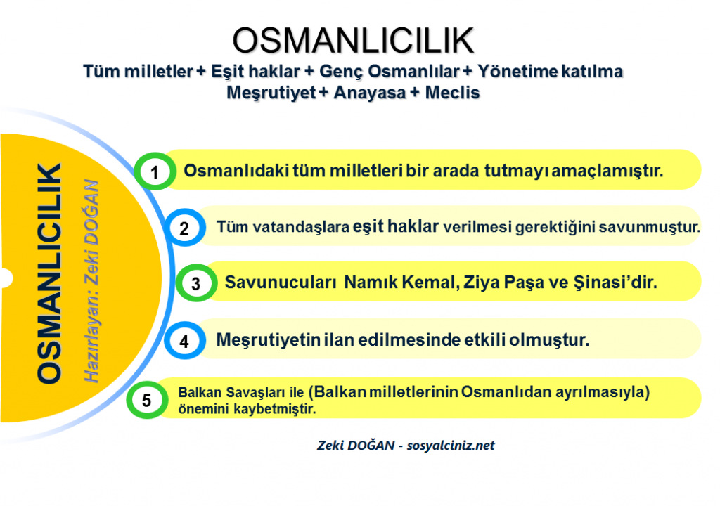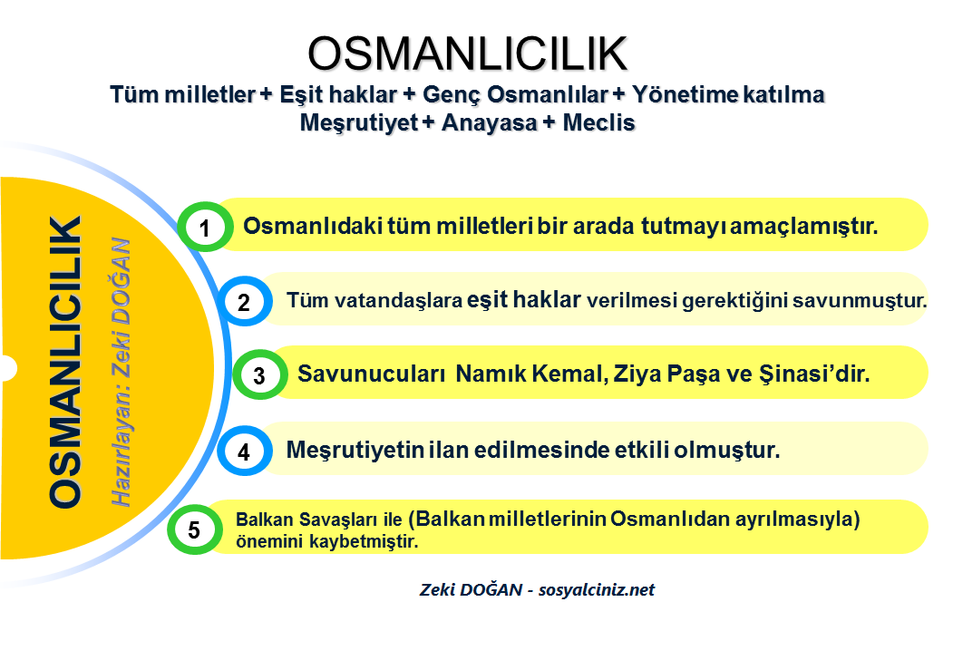 - Osmanlıcılık: Osmanlı İmparatorluğu’ndaki tüm etnik ve dini grupların eşit haklara sahip olduğu bir Osmanlı kimliği altında birleşmesini savunan akım.