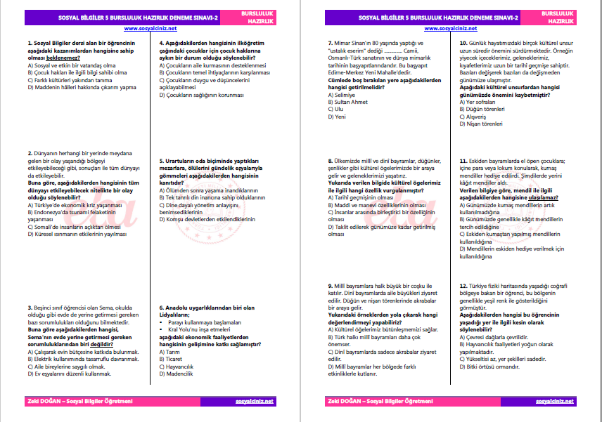SOSYAL BİLGİLER 5 BURSLULUK HAZIRLIK DENEME SINAVI 2 İNDİR