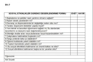 Sosyal Etkinlikler Öğrenci Değerlendirme Formu EK-7 İNDİR