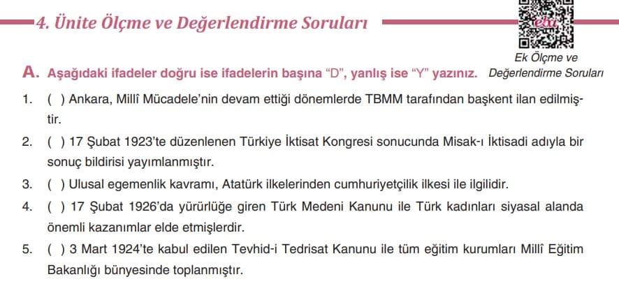 T.C. İnkılap Tarihi Dersdestek 4.Ünite Ölçme ve Değerlendirme Soruları Cevapları