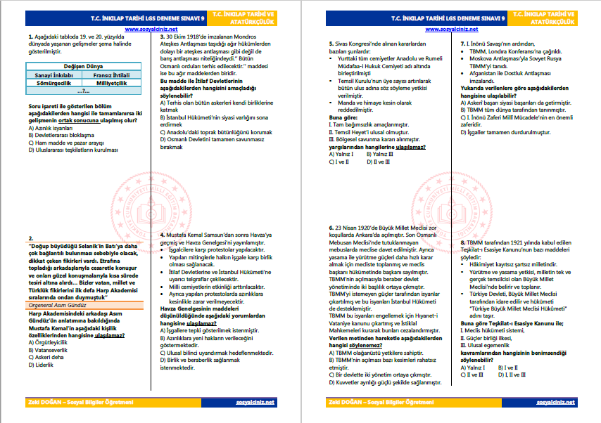 T.C. İnkılap Tarihi LGS Deneme Sınavı-9
