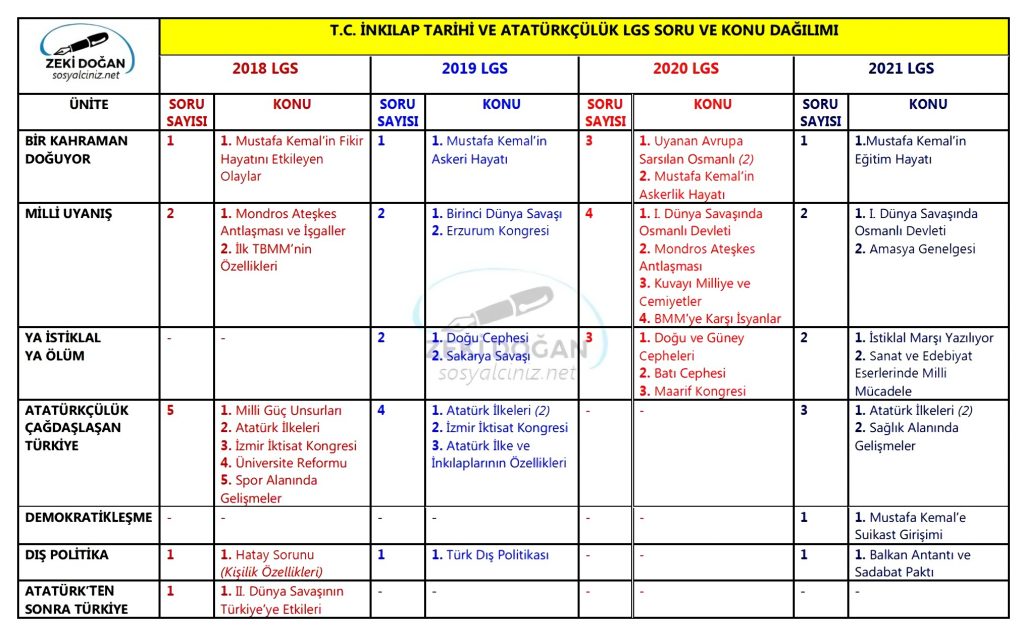T. C. İnkılap Tarihi LGS Soru ve Konu Dağılımı 2018-2021