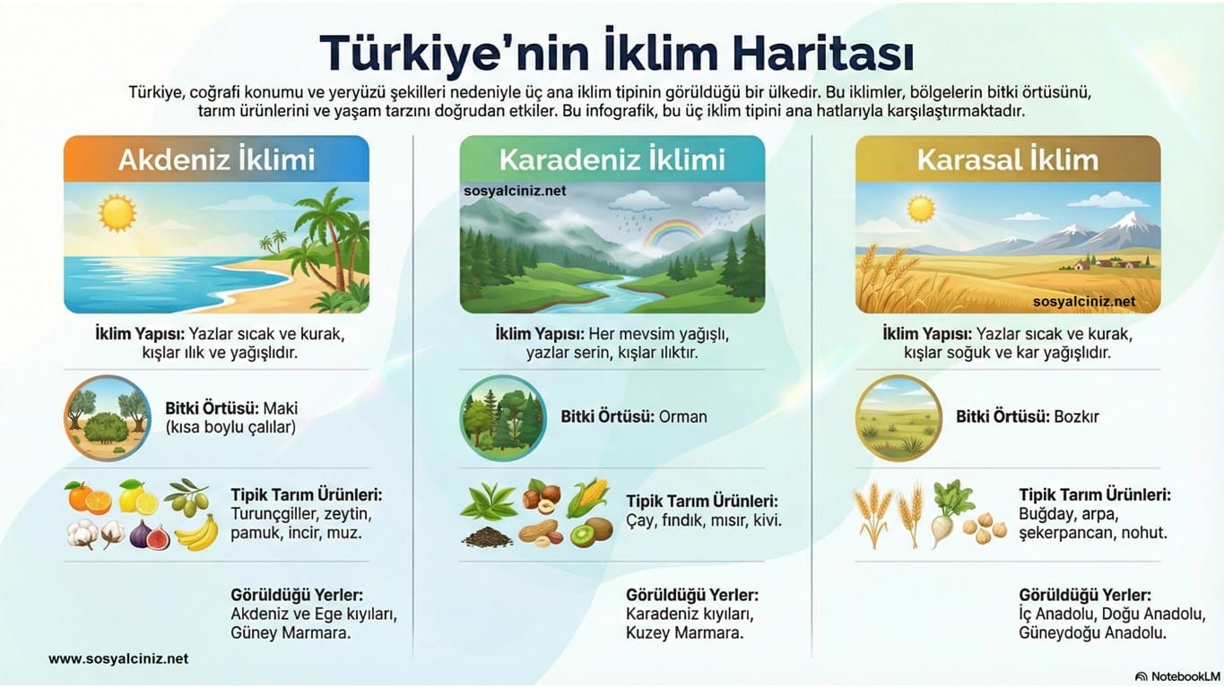 6.Sınıf Sosyal Bilgiler 2.Öğrenme Alanı Evimiz Dünya Doğal ve Beşeri Çevre Özellikleri Arasındaki İlişki konusu için hazırlamış Türkiye’de Görülen İklimler infografiğidir.
