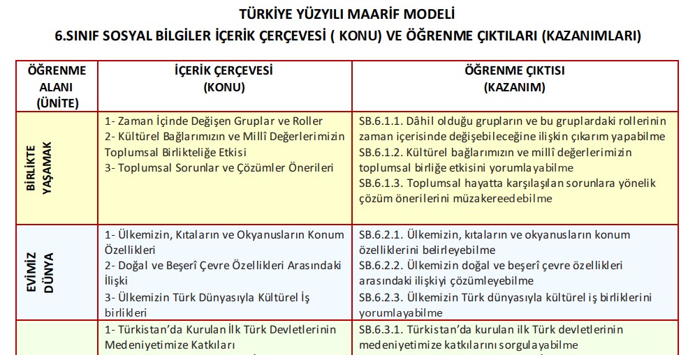 TYMM 6.sınıf sosyal bilgiler konu ve kazanımları